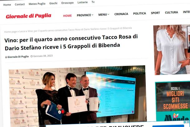 LECCE - Per il quarto anno consecutivo Tacco Rosa, Salento IGT da Negroamaro 100%, di Tenute Stefàno, riceve i Cinque Grappoli di Bibenda.